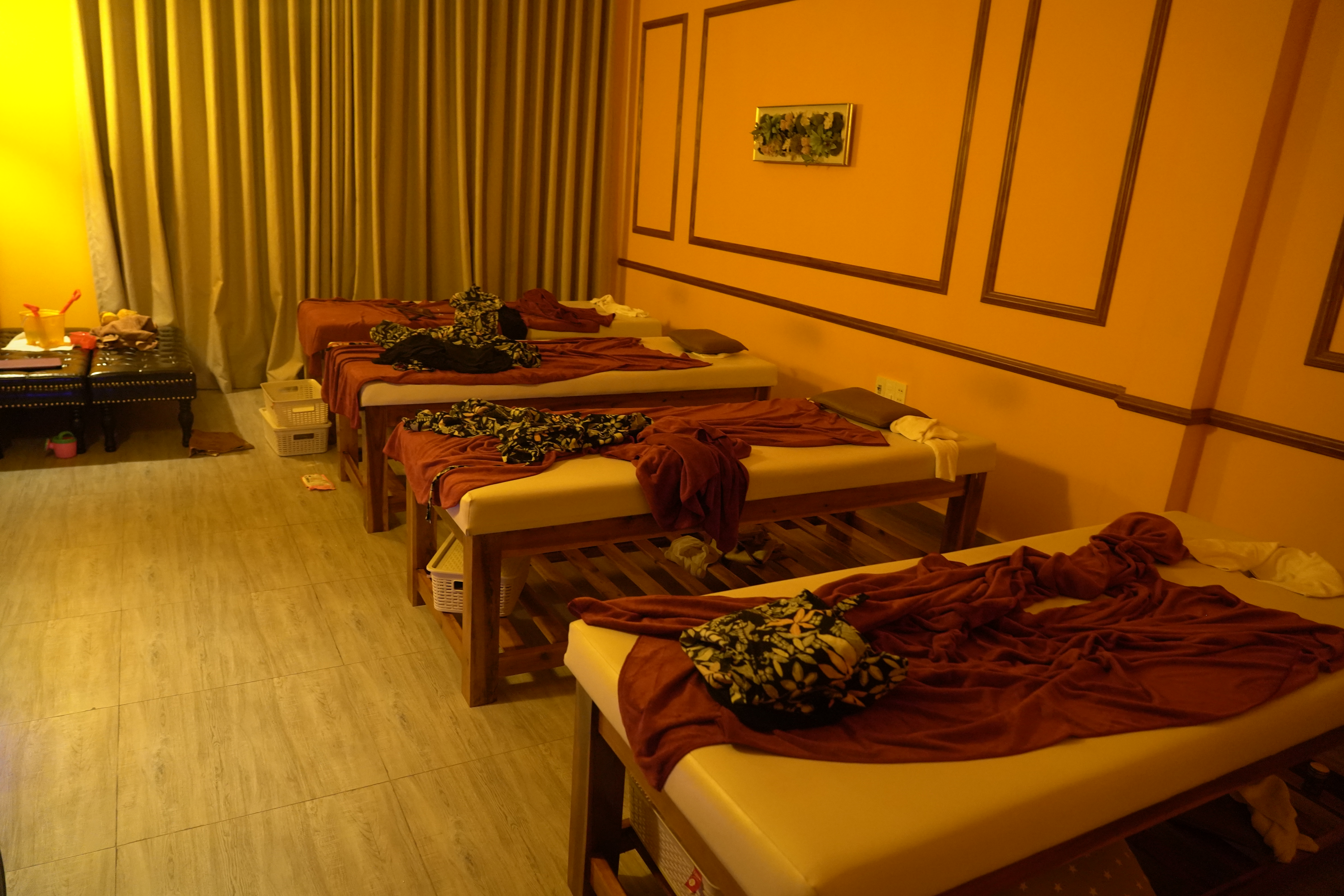 막내는 잠을 자서 소파 위에 눕혀 놓고, 네명이서 쪼로록 누워서 마사지를 받았다.
