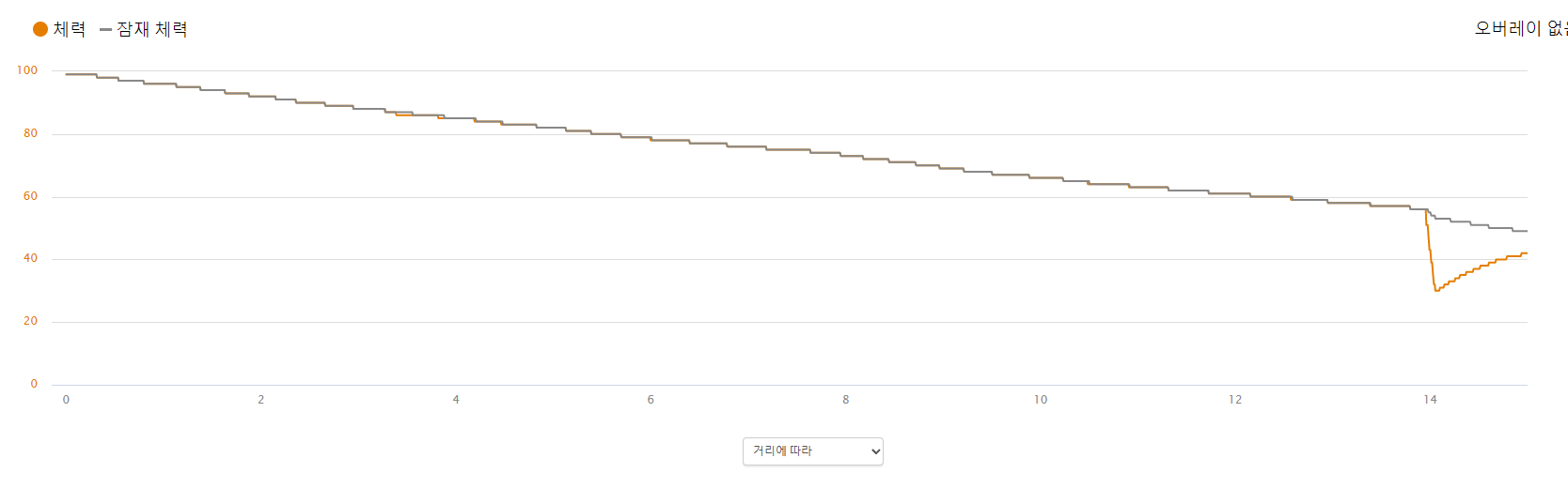 15km 지점에서 체력도 40% 수준으로 지난 대회(0%) 보다 나은 수준이지만, 페이스를 높여야 하프 서브2 가 가능하다.