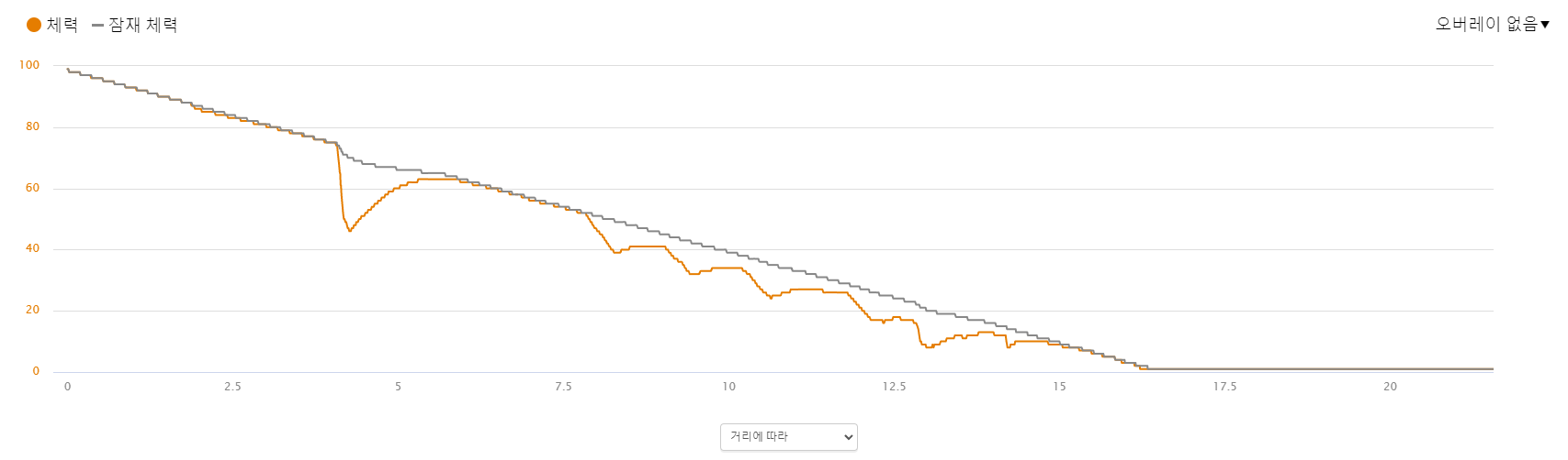 가민으로 측정한 데이터, 16키로 지점에서 체력이 방전되었다 나오는데, 정확하다 ㄷㄷㄷ