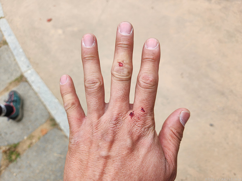 손이랑 팔꿈치, 무릎, 발목 등에 등반의 흔적이 가득