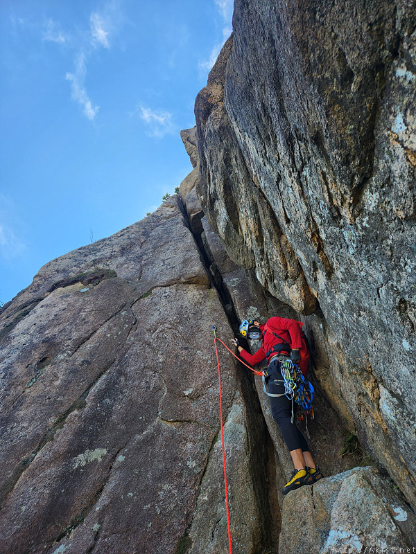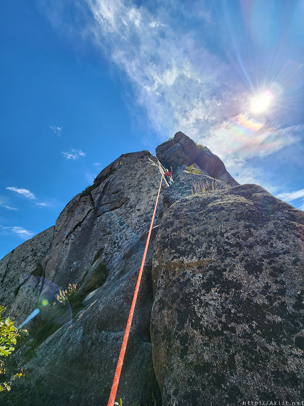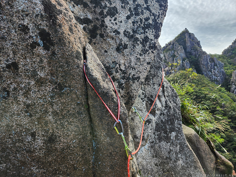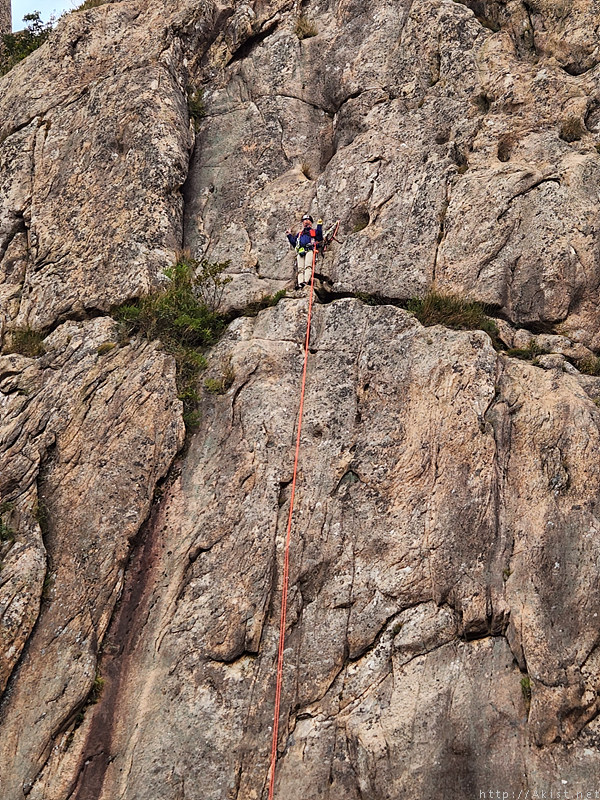 절벽위 바위 모서리를 퀵을 이용하여 돌아간 후 짧은 크랙을 오르면 등반은 끝이 난다.