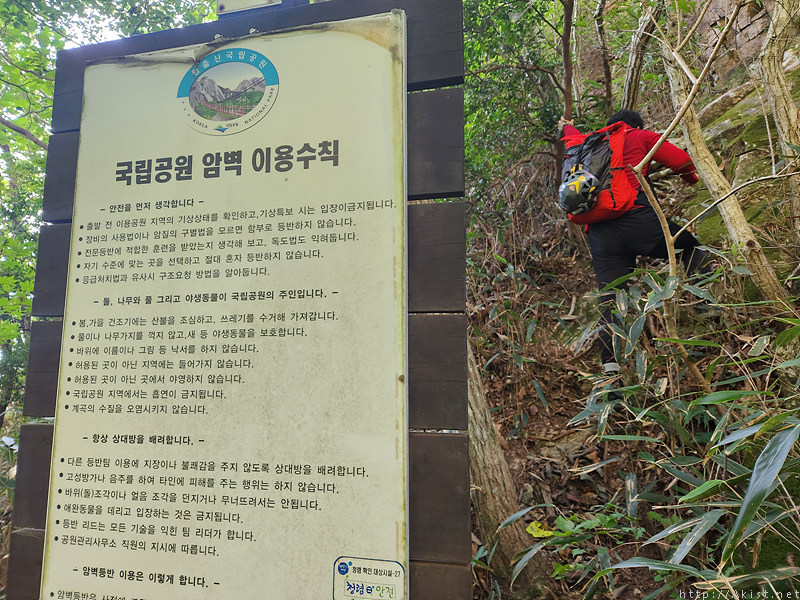 암벽 이용수칙을 지나 뚜렷하지는 않지만 구분되는 길을 따라 10분정도 오르면 시작점에 닿는다.