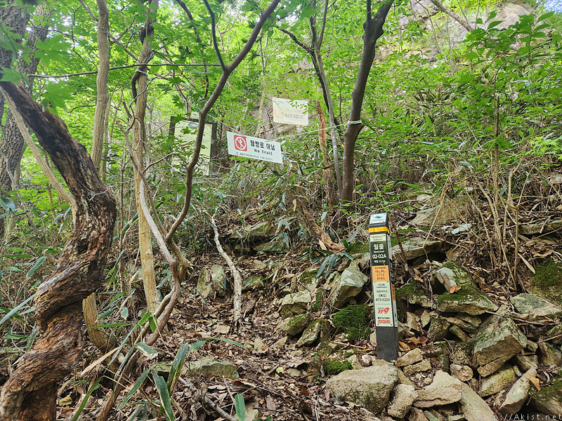 어프로치는 바람계곡 방향으로 40분 정도 쭈욱 올라가다, 02-02 이정표에서 '탐방로 아님' 방향으로 올라가면 된다.